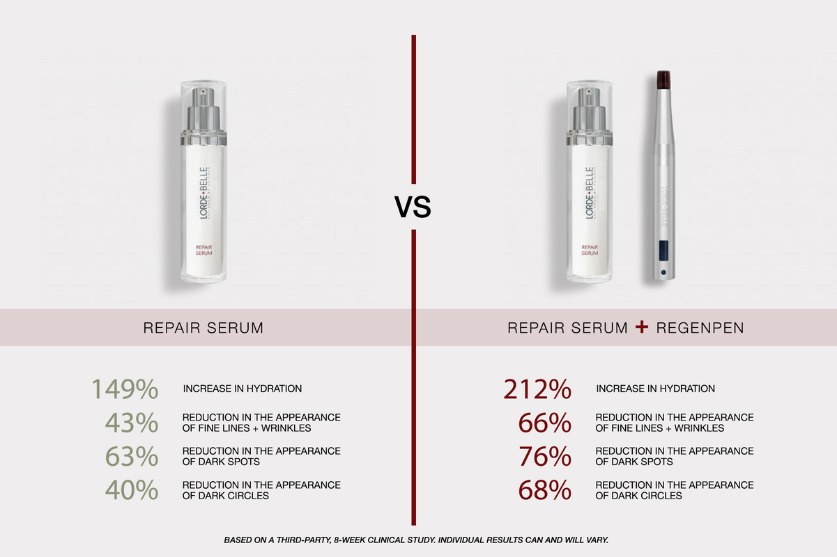 Princeton Consumer Research (PCR) a menĂ© une Ă©tude clinique de 8 semaines en utilisant le sĂ©rum rĂ©parateur Lorde + Belle et RegenPenâą. Soixante-six participants d'un large Ă©ventail de donnĂ©es dĂ©mographiques et de tons de peau sur l'Ă©chelle de Fitzpatrick ont ââparticipĂ© Ă cette Ă©tude. La moitiĂ© des participants ont utilisĂ© le SĂ©rum RĂ©parateur deux fois par jour et l'autre moitiĂ© a utilisĂ© le SĂ©rum RĂ©parateur deux fois par jour et une fois avec le RegenPenâą. Pour mesurer les rĂ©sultats, PCR a observĂ© la peau des participants avant et aprĂšs 4 et 8 semaines d'utilisation de trois maniĂšres diffĂ©rentes : mesurĂ©e par une machine, Ă©valuation visuelle tierce et auto-Ă©valuation.
